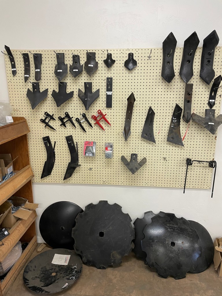 A full line of cultivator shovels, chisel plow shovels, and other agricultural tillage parts and hardware.